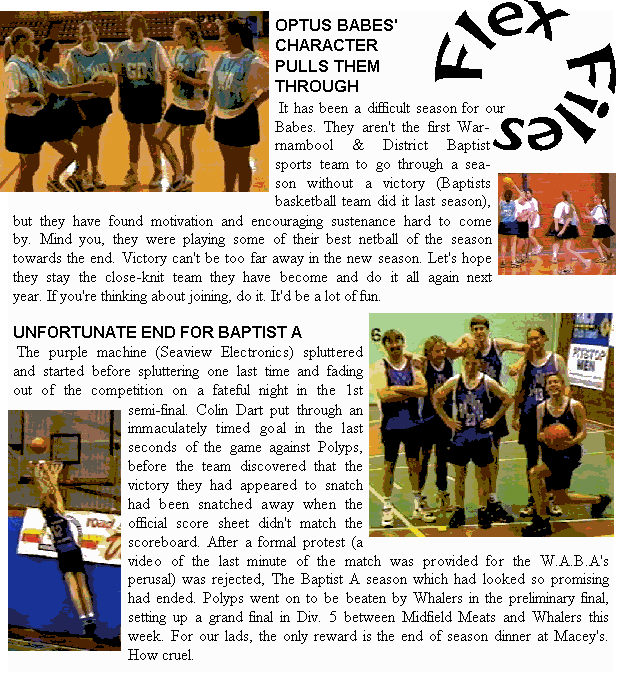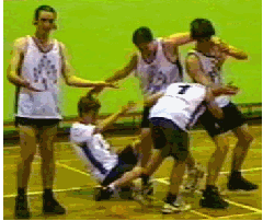 Cumbered with a comsiderably tougher draw than their purple stablemates, the white team (Thomas Catering Equipment) actually lost their last six matches, having been in the four for most of the season. They can hold their heads up, though, as they have battled nobly with an unsettled line-up (12 players were used during the season), and several of their players are now better basketballers than they have ever been. Daryl Davey
