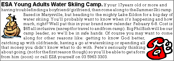 Plan now to come along on the Church Family Camp on March 13 till March 15. Discover for yourself that the older folk aren't all serious and the younger folk aren't all silly. As the name suggests, it's all one big family.